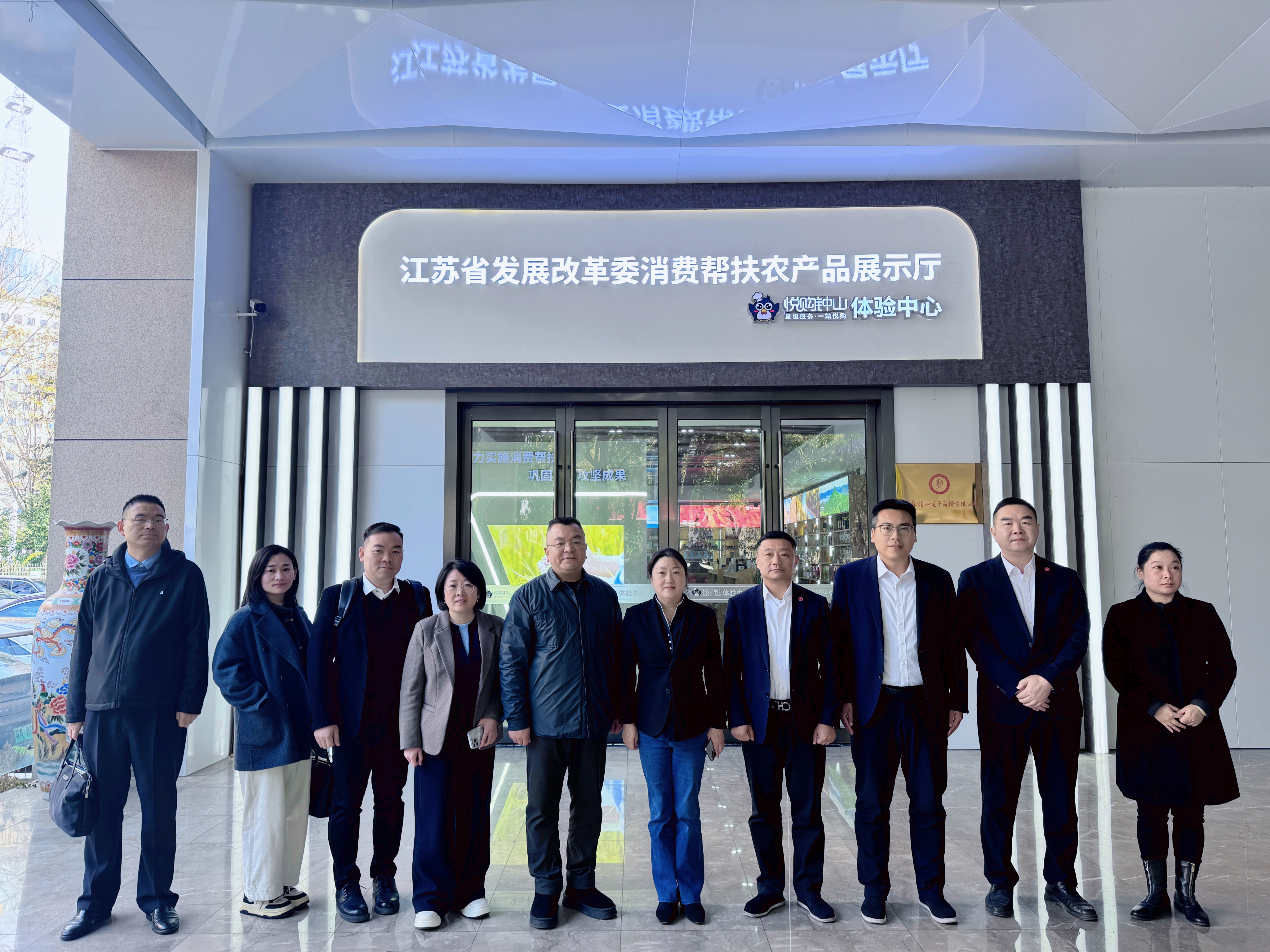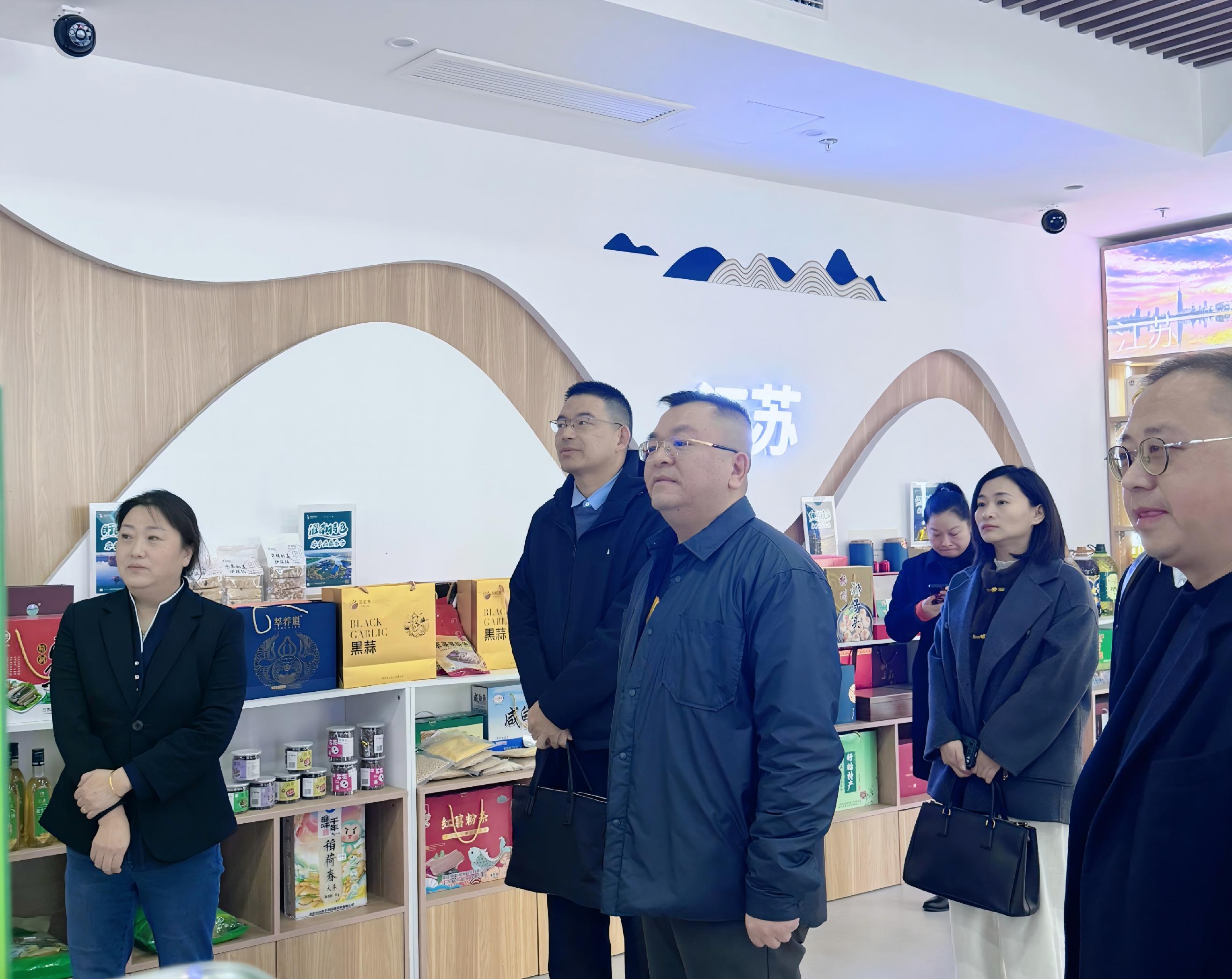 座谈前,大家参观了江苏省发展改革委消费帮扶农产品展示厅悦购钟山体验中心。展厅由江苏钟山宾馆集团有限公司与江苏省发改委联合打造,集展示、体验、销售、洽谈于一体,设有农产品展示区、云上专区、品鉴区及直播区,通过“线上+线下”融合,为东西部农产品搭建直通长三角市场桥梁和纽带。